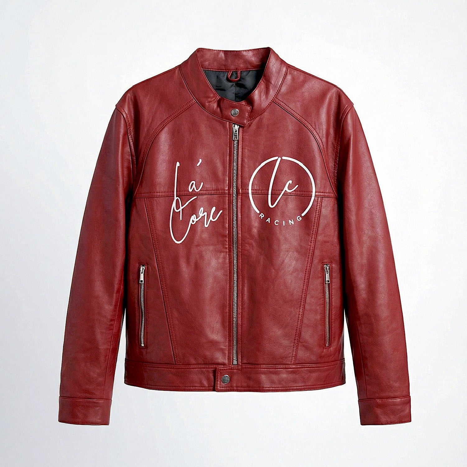 A deep burgundy leather jacket with clean moto-inspired lines and a smooth, structured silhouette. The front features understated La’Core and LC Racing graphics in crisp white, adding a refined contrast without overwhelming the design. Finished with minimal hardware and subtle seaming, it delivers a polished, modern edge.