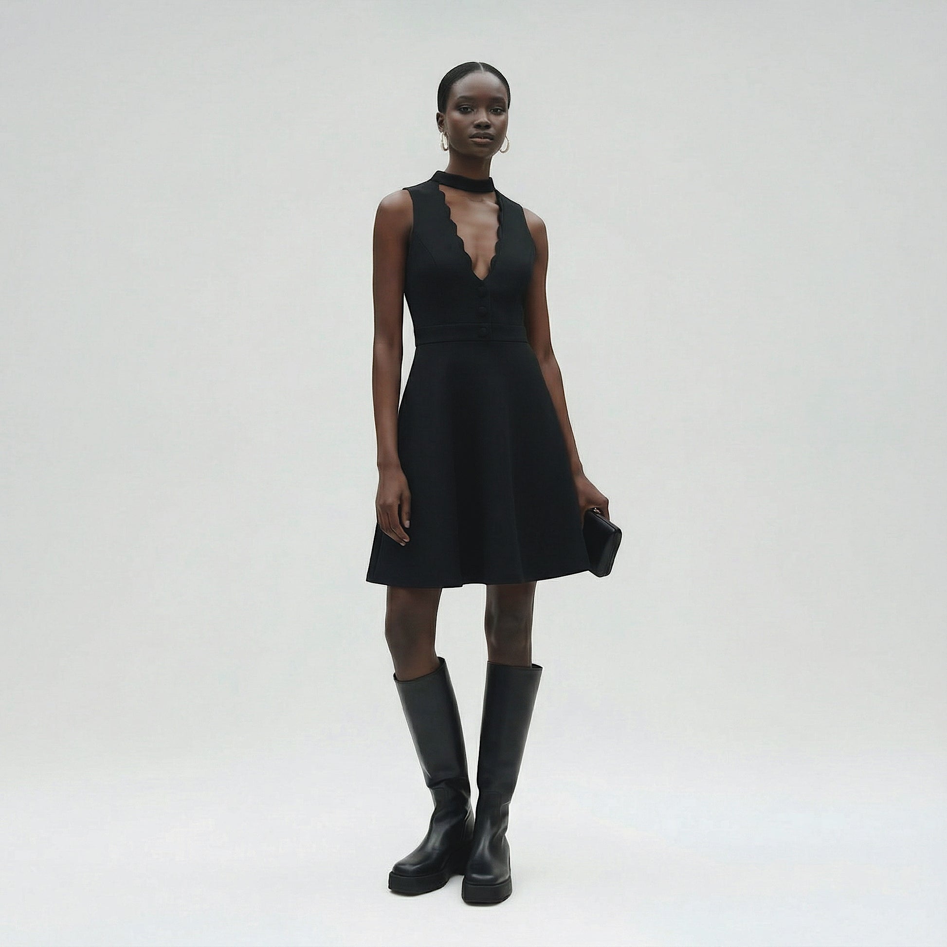 Cut with La’Core’s signature sculptural precision, this minidress pairs a clean choker neckline with a scalloped plunge that feels both modern and delicately romantic. The bodice is tailored to skim the frame before releasing into a soft, architectural flare that moves with quiet intention. Rendered in a dense, matte-black fabric that holds its shape beautifully, it embodies the brand’s language of disciplined femininity—minimal, sensual, and effortlessly commanding.